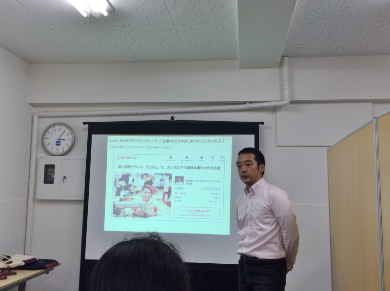 今回、クラウドファンディングのReadyforで、新ブランド「SUSU」の、オンラインストアや新商品づくりの資金を募りました。無事目標達成(475万円)したので、共同代表の青木健太さんが帰国し報告会の運びとなりました。